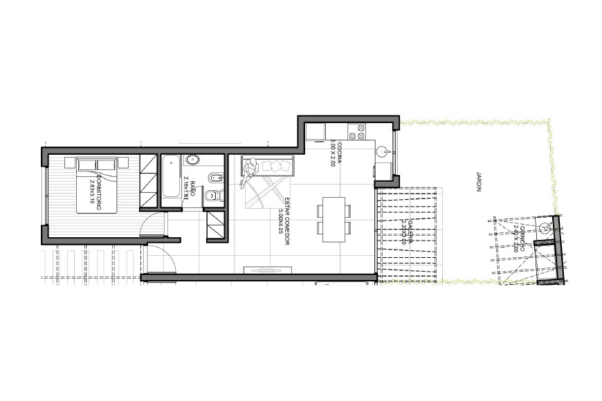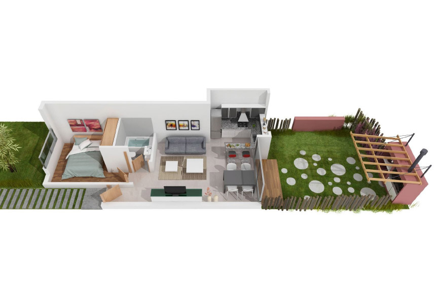 42 m2 cubiertos + 1,6 m2 semicubiertos + 5 m2 de quincho + 19 m2 de jardín + 12,5 m2 de cochera.