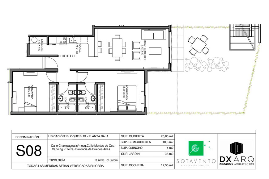 Cocina integrada en forma de L al living comedor, lavadero separado, 2 habitaciones con placard (una de ellas con baño propio), otro baño adicional. Parilla. Ubicación planta baja. Sup cubierta 70 m Sup semicubierta 10,5m Sup quincho 4 m Sup jardín 31/36 m Cochera 12,5