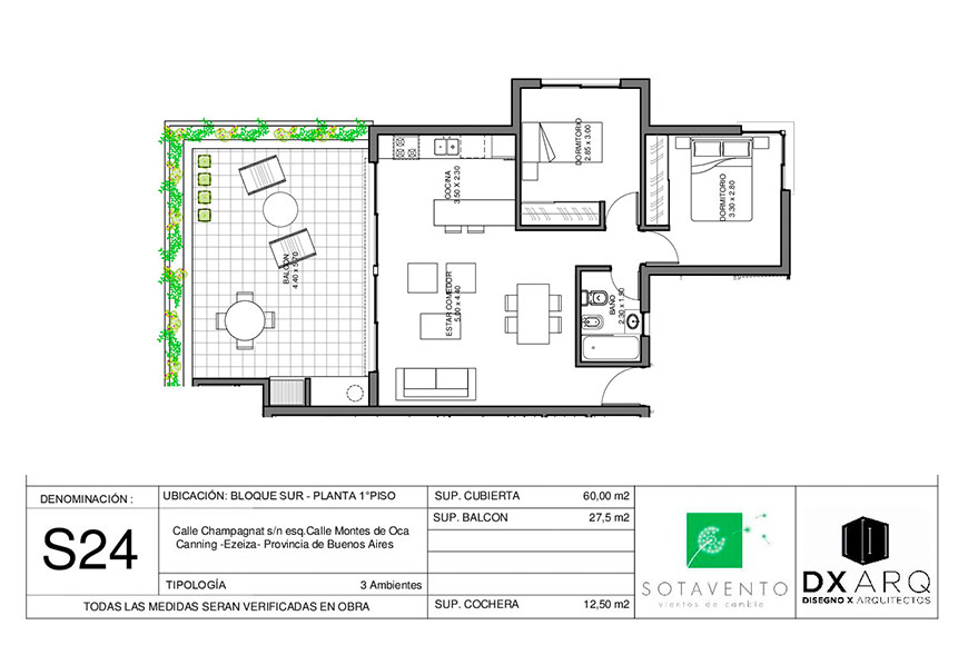 Cocina lineal y barra que se integra al living comedor, baño completo y dos habitaciones con placard. Parrilla. Ubicación en primer piso. Sup cubierta 60 m Sup terraza 27,5 m Cochera 12,5