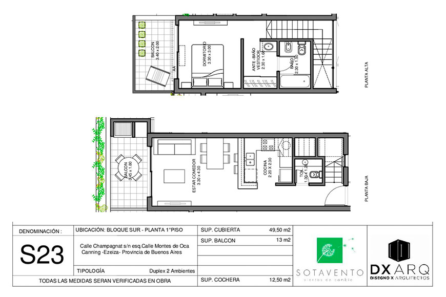 En primer piso cocina integrada al living comedor, toilette, balcón con parrilla. En segundo piso habitación en suit con baño, antebaño , vestidor y balcón. Ubicación 1er y 2do piso del bloque. Sup cubierta 49,50 m Sup balcón 13 m Cochera 12,5 m